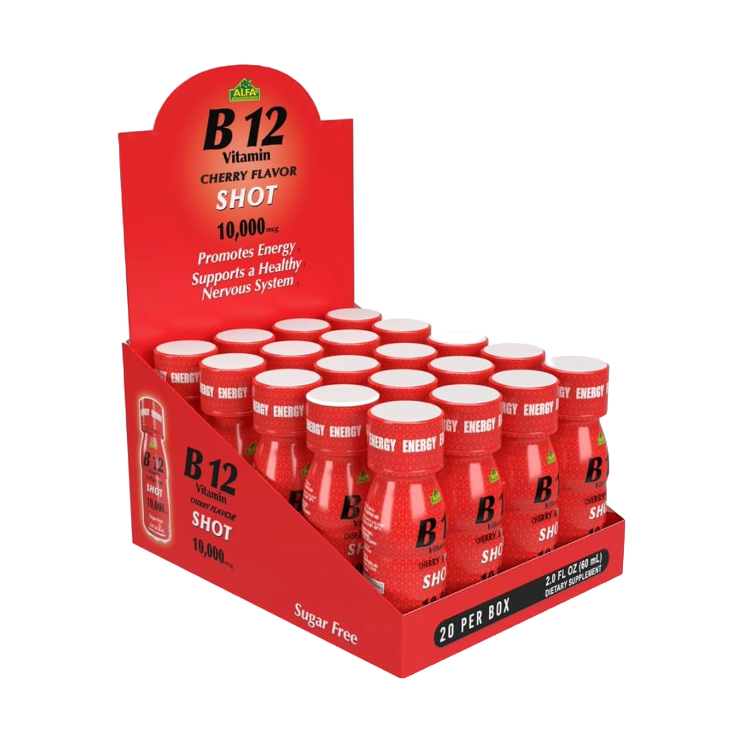 Alfa B-12 Shots are your go-to supplement for fighting fatigue and staying mentally sharp. Each shot contains 2,000 mcg of Vitamin B-12, an essential nutrient that plays a key role in energy metabolism, red blood cell formation, and nervous system function. Delivered in an easy-to-use liquid format, B-12 is quickly absorbed into the bloodstream, making these shots perfect for individuals with low energy, restricted diets, or poor B-12 absorption. No needles, no pills — just a quick daily boost.