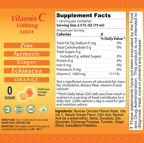 Each 10mL shot contains 1,000 mg of Vitamin C (ascorbic acid) in a liquid base with purified water, natural citrus flavoring, stevia, citric acid, and potassium sorbate as a preservative. Sugar-free and free from gluten, dairy, and artificial colors.