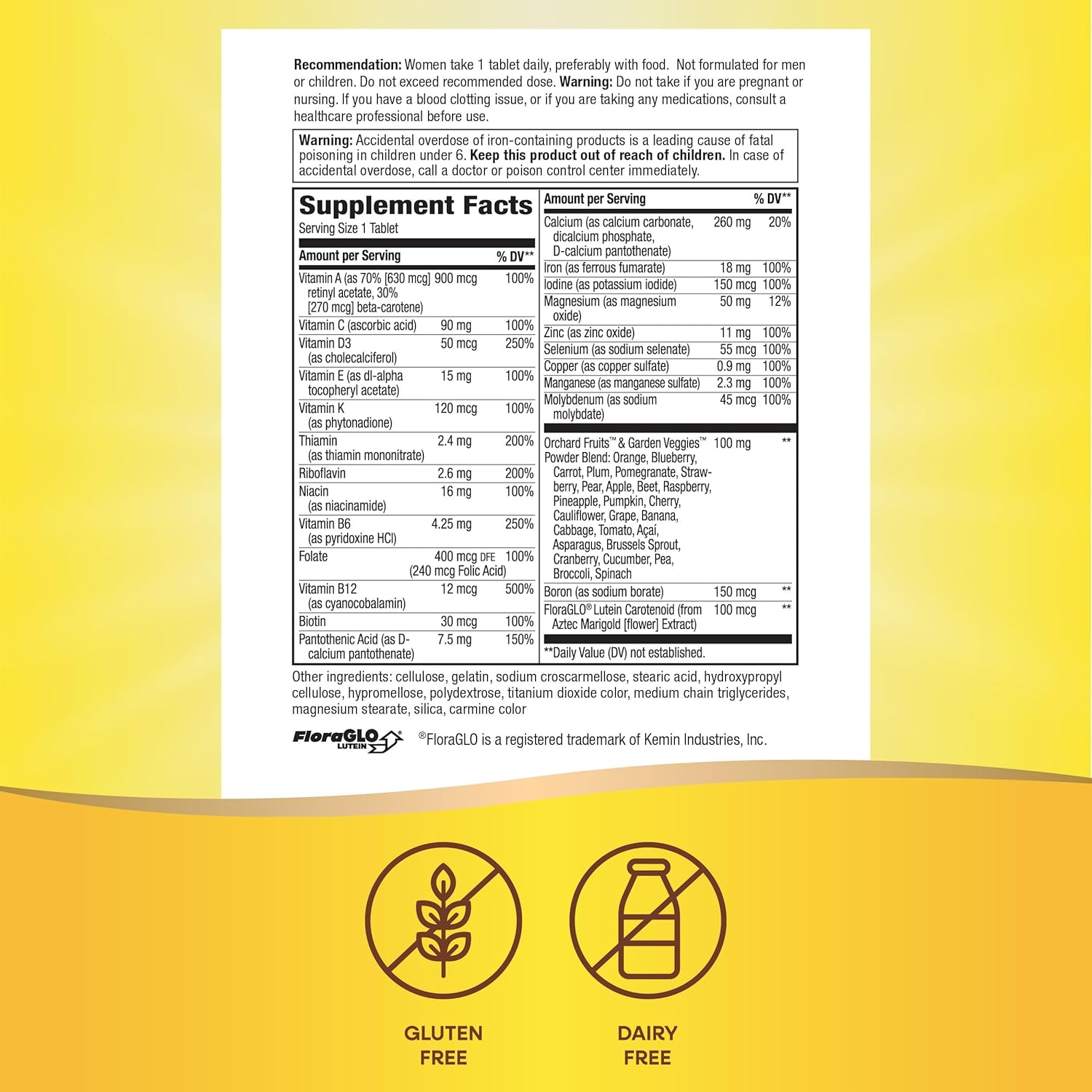 Orchard Fruits™ & Garden Veggies™ Powder Blend: Blueberry, Orange, Carrot, Pomegranate, Plum, Strawberry, Apple, Beet, Pear, Tomato, Raspberry, Broccoli, Cherry, Spinich, Cauliflower, Grape, Açaí, Asparagus, Banana, Brussels Sprout, Cabbage, Cranberry, Cucumber, Pea, Pineapple, Pumpkin 100 mg ** Lycopene 600 mcg ** Boron (as sodium borate) 150 mcg ** Lutein Carotenoid from FloraGLO® Aztec Marigold Extract (flower) 100 mcg **; Other Ingredients: cellulose, sodium croscarmellose, gelatin, hydroxypropyl cellulose, stearic acid, hypromellose, magnesium stearate, polydextrose, titanium dioxide color, silica, riboflavin color, medium chain triglycerides