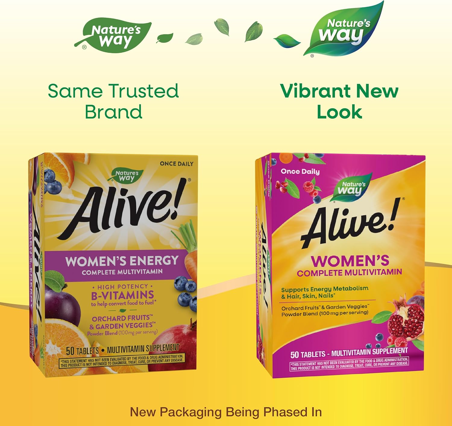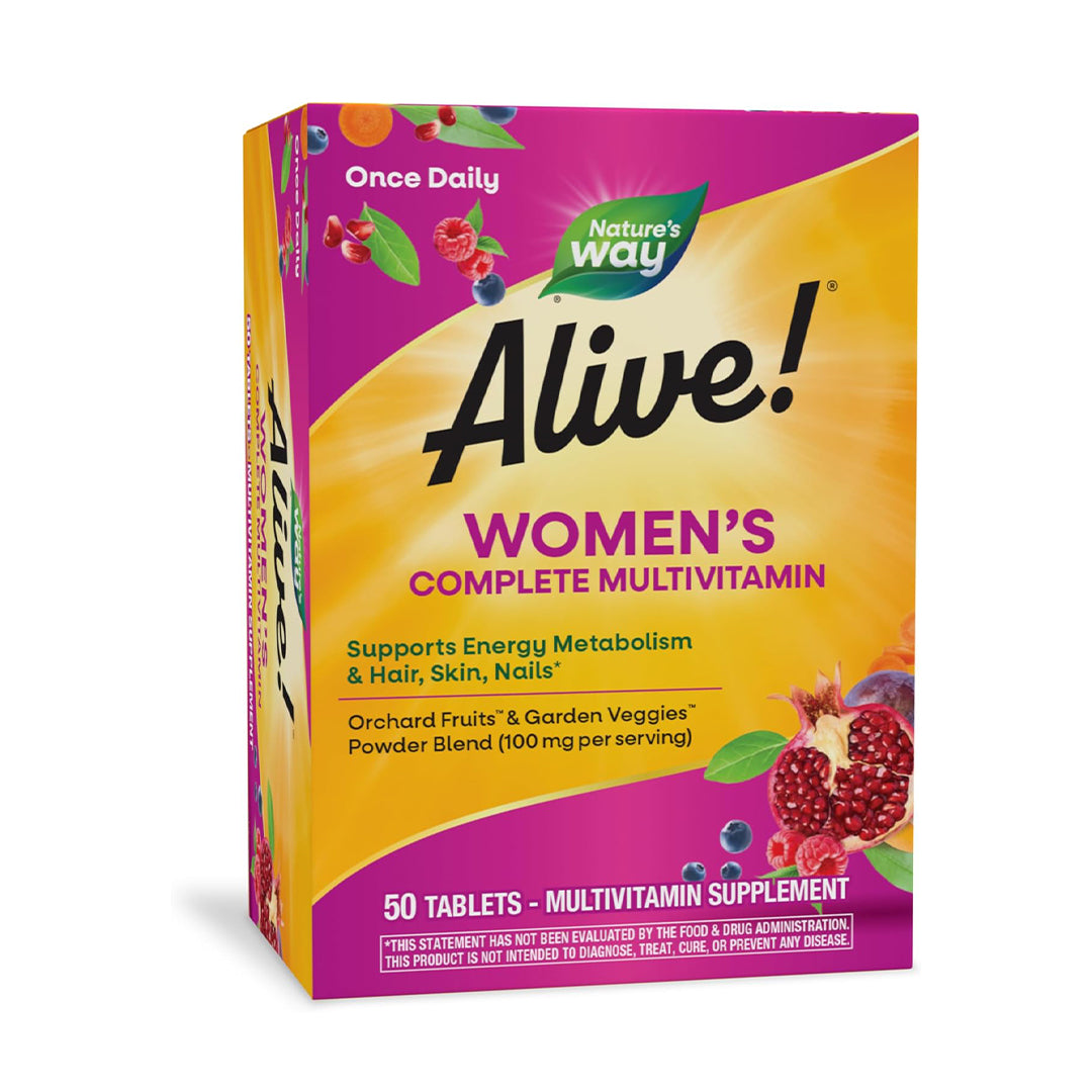 Nature's Way Alive! Women’s Energy Multivitamin delivers essential nutrients with high-potency B-vitamins to boost energy, plus a blend of Orchard Fruits™ and Garden Veggies™. Perfect for everyday vitality and overall wellness!