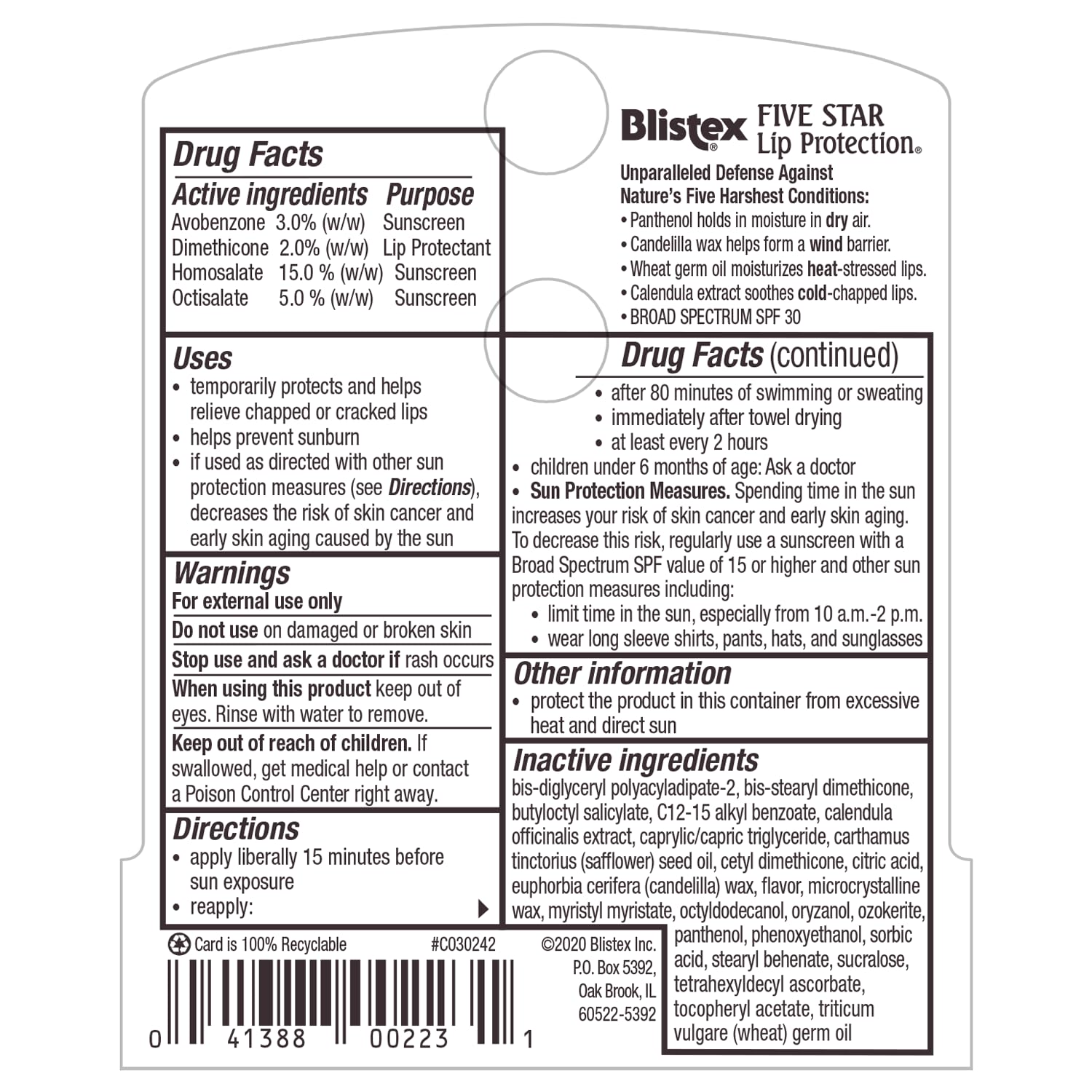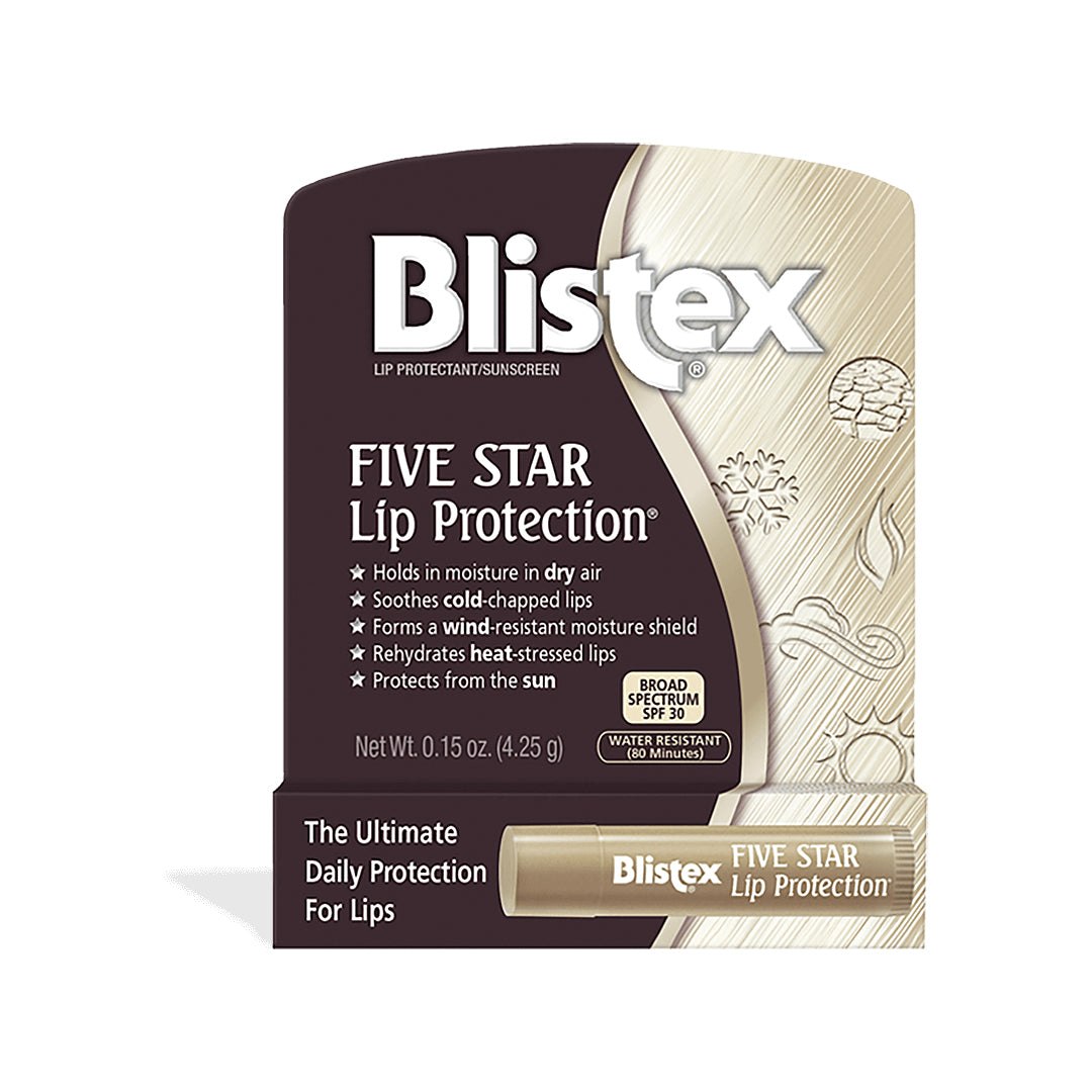 Blistex Five Star Lip Protection is constructed from five specialized ingredients to deliver unparalleled defense against nature’s harshest conditions from dryness, sun, heat, cold, and wind. Perfect for those hotter than hot summers and bitter cold winters. Panthenol helps hold in moisture while in dry air. Wheat Germ Oil provides moisture relief for heat-stressed lips. Water Resistant for up to 80 minutes. Candelilla helps form a wind barrier. Broad Spectrum SPF 30 provides UVA/UVB sun protection. For external use only. Do not use on damaged or broken skin. Keep out of reach of children. Ask a doctor before using on children under two years of age.