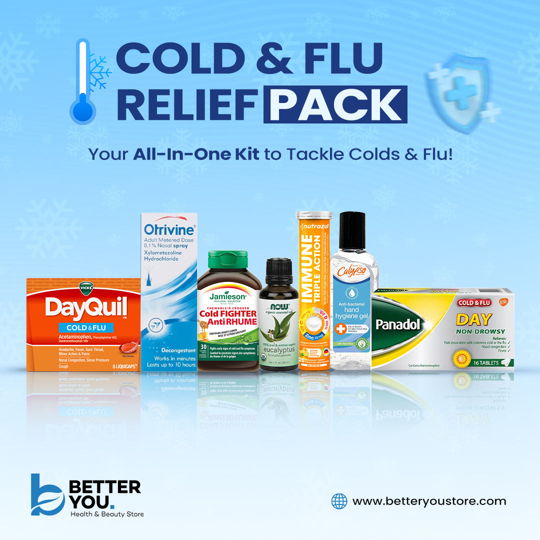 Get ultimate relief and protection with the Cold & Flu Relief Bundle, packed with premium products valued at $70.00! Includes Panadol or DayQuil (stock-based), Jamieson Cold Fighter, Nutrazul Immune Triple Action, Otrivin Metered Nasal Spray, Calypso Anti-Bacterial Hand Gel, and a FREE Eucalyptus Oil.