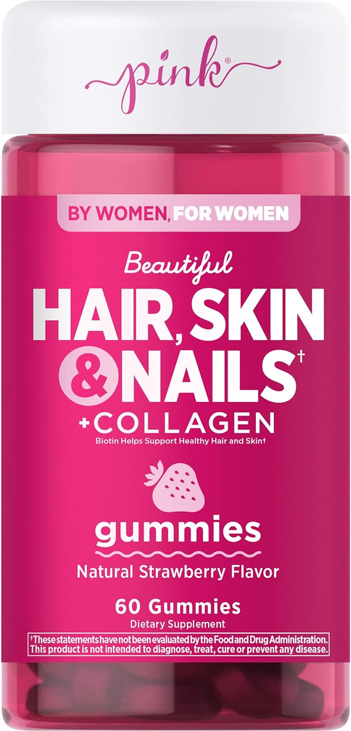 Unlock your inner glow with Pink Beautiful Hair, Skin, Nails + Collagen Gummies! Formulated with 3,000 mcg of biotin and 100 mg of hydrolyzed collagen, these berry-flavored gummies provide essential nutrients to enhance your natural beauty from the inside out. With added vitamins C and E, these gummies support collagen synthesis and protect your skin from oxidative stress, promoting radiant skin, strong nails, and healthy, vibrant hair. Perfectly crafted for women who want an easy, delicious way to prioritize self-care, these gummies are non-GMO, gluten-free, and free from artificial flavors – helping you achieve that beautiful, healthy look you deserve!