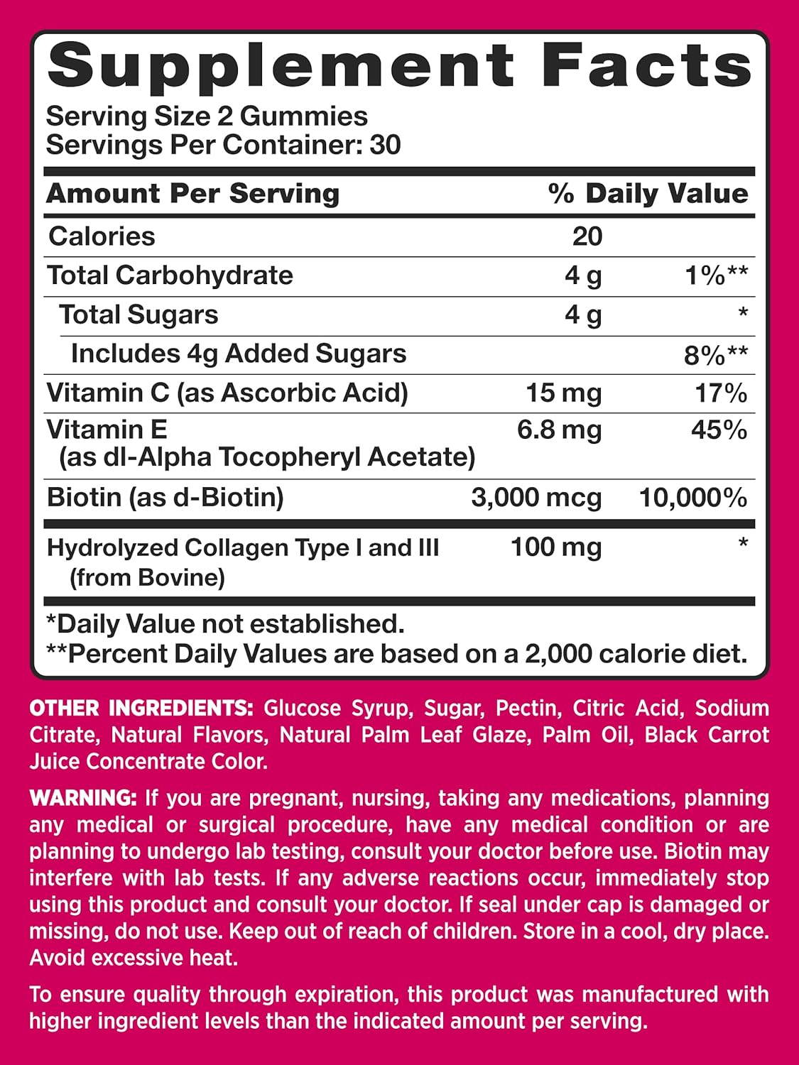 Vitamin C, Vitamin E, Biotin, Collagen. Other Ingredients: Glucose Syrup, Sucrose, Gelatin, Sorbitol, Citric Acid, Agar, Natural Flavor, Natural Palm Leaf Glaze, Vegetable Oil, Black Carrot Juice Concentrate Color.