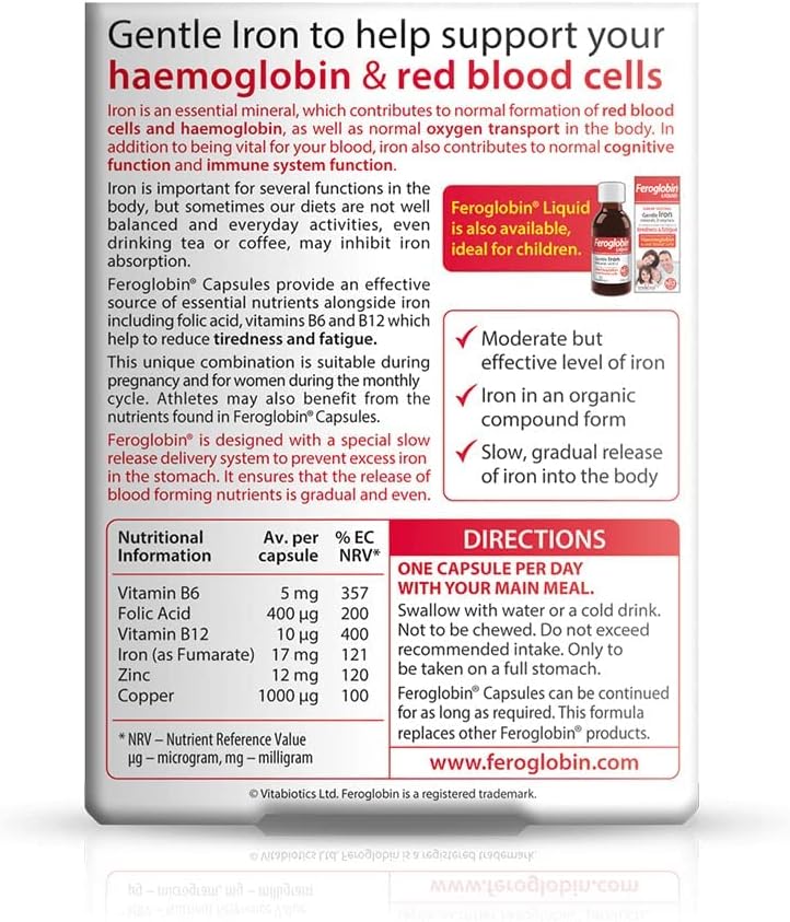 Gentle iron to help support your haemoglobin & red blood cells. Feroglobin Capsules are a gentle iron supplement with zinc and B vitamins, formulated to deliver an ideal amount of iron to the body while remaining gentle on the stomach.