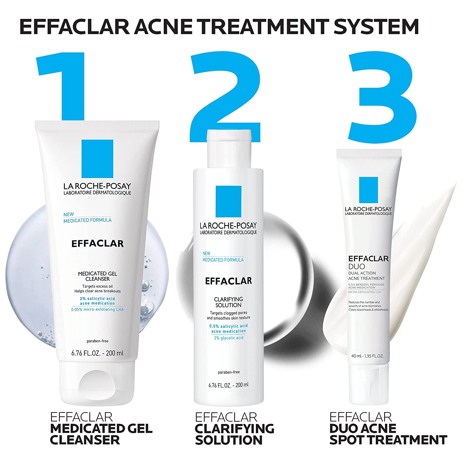The La Roche-Posay Effaclar Dermatological 3-Step Acne Treatment System includes a medicated gel cleanser, clarifying solution, and acne treatment to effectively reduce acne and prevent future breakouts.
