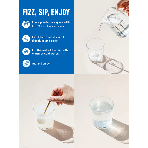 Mixing: Dissolve the powder in 2-3 ounces of warm water, allowing it to fizz. Once the fizzing subsides, add additional warm or cold water to taste.