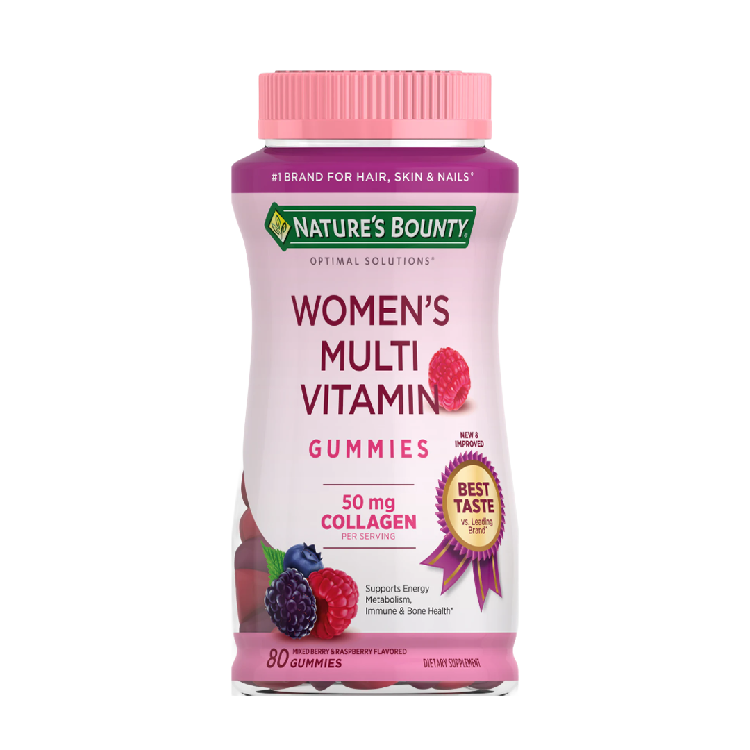 Nature’s Bounty Women’s Multivitamin Gummies are expertly formulated to meet the unique nutritional needs of women. These delicious gummies provide a blend of vitamins and minerals including D3 for bone support, B-vitamins for energy, and folic acid for reproductive health. A tasty and easy way to stay on top of your wellness game — without the need to swallow pills.