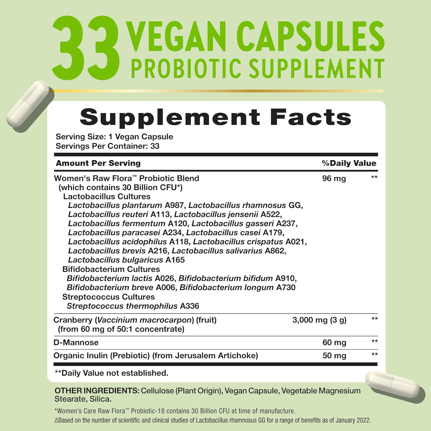Contains a proprietary probiotic blend including Lactobacillus acidophilus, L. rhamnosus, L. reuteri, L. gasseri, Bifidobacterium lactis, and others, totaling 50 Billion CFU. Also includes Cranberry Fruit Powder and Inulin (Prebiotic). Vegetarian capsules. Free from gluten, soy, dairy, artificial colors, and preservatives.