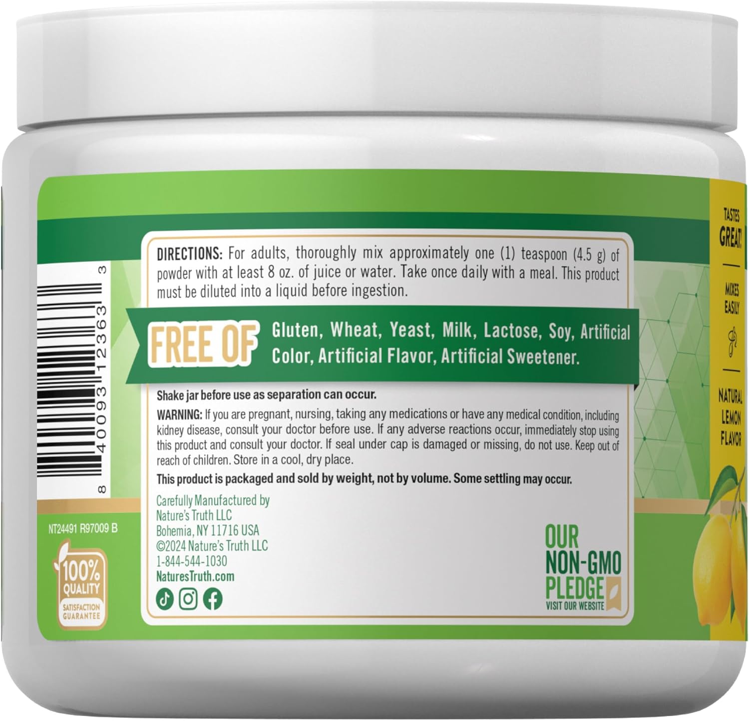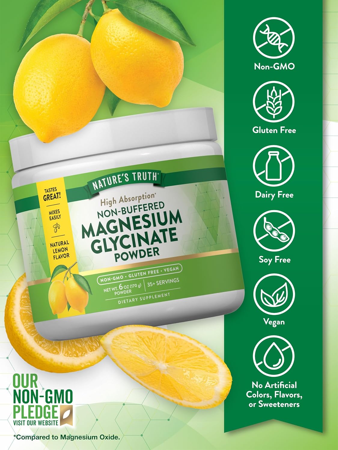 Experience optimal magnesium absorption with Nature's Truth Magnesium Glycinate Powder. This non-buffered, vegan-friendly supplement provides 250 mg of highly bioavailable magnesium per serving, supporting muscle relaxation, nerve function, and overall wellness. Its natural lemon flavor ensures a refreshing taste with every sip.