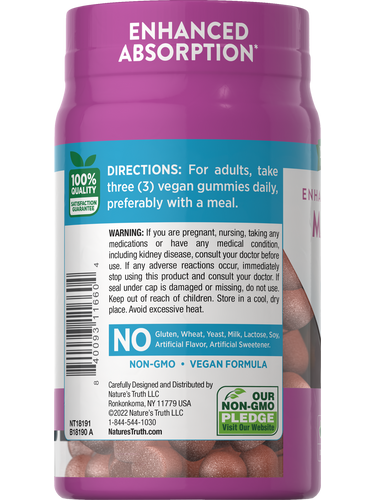 At Nature’s Truth®, we take pride in each and every nutritional supplement we create. These Magnesium Gummies are vegan, as well as non-GMO, gluten free, wheat free, yeast free, milk free, lactose free, soy free, artificial flavor free, and artificial sweetener free.