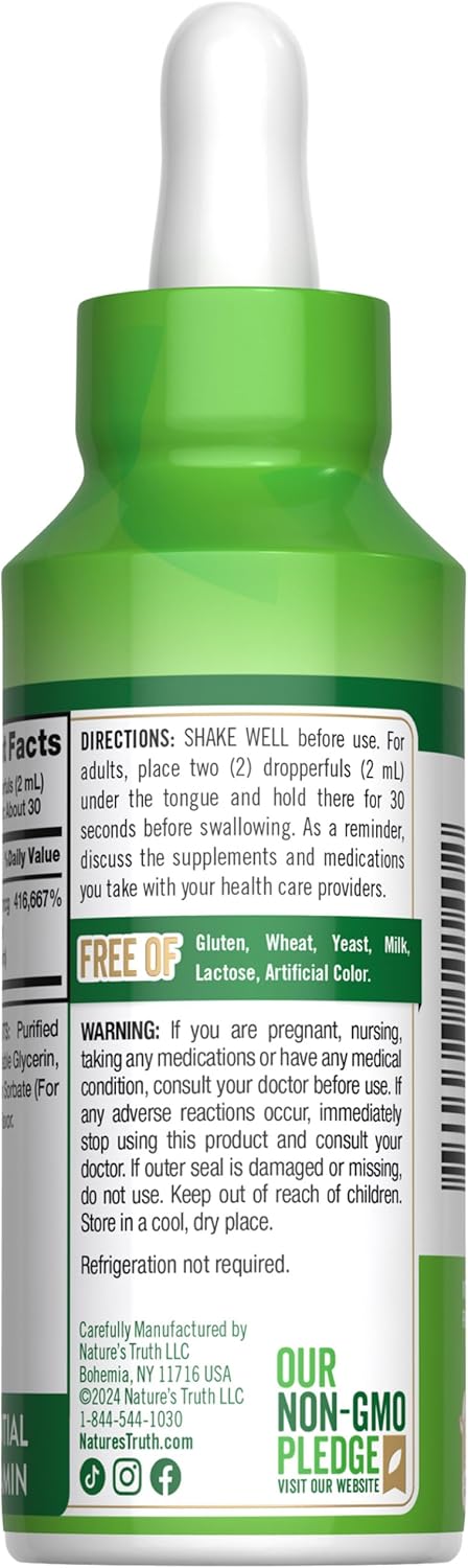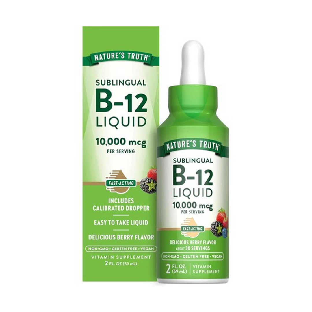 Nature's Truth Vitamin B-12 Sublingual 10,000 mcg Liquid is made with Vitamin B-12 (as Cyanocobalamin) to support energy metabolism, nervous system health, and red blood cell production. It features Vegetable Glycerin for a smooth texture, Purified Water, Natural Berry Flavor, Citric Acid for pH balance, Potassium Sorbate as a preservative, and Stevia Extract for natural sweetness. This non-GMO and gluten-free formula is free from artificial colors and flavors. Shake well before use. For adults, place one full dropper (1 mL) under the tongue daily and hold it for 30 seconds before swallowing for fast absorption. Store in a cool, dry place away from direct sunlight. Consult a healthcare professional before use if pregnant, nursing, taking medications, or if you have a medical condition. Keep out of reach of children.