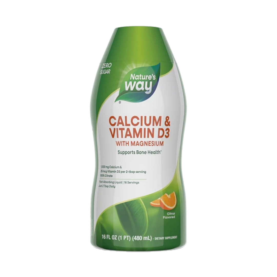 Nature's Way Calcium & Vitamin D3 Liquid Supplement provides a fast-absorbing, sugar-free citrus-flavored formula designed to support bone health. Each 2-tablespoon serving delivers 1,000 mg of calcium (as calcium citrate and calcium magnesium citrate), 25 mcg (1,000 IU) of vitamin D3 (as cholecalciferol), 40 mg of magnesium (as calcium magnesium citrate), and 250 mcg of boron (as boron aspartate). This liquid supplement is ideal for individuals seeking an alternative to tablets or capsules.