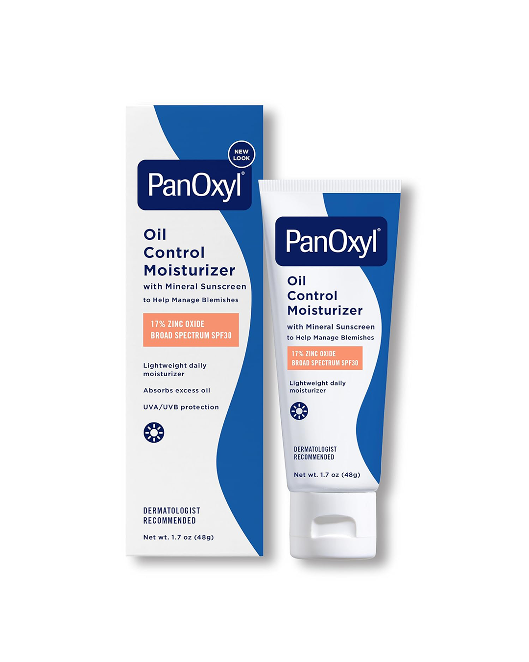 Hydrate, protect, and control shine with PanOxyl Oil Control Moisturizer SPF 30, a lightweight, dermatologist-recommended sunscreen formulated with 17% Zinc Oxide for broad-spectrum UVA/UVB protection.